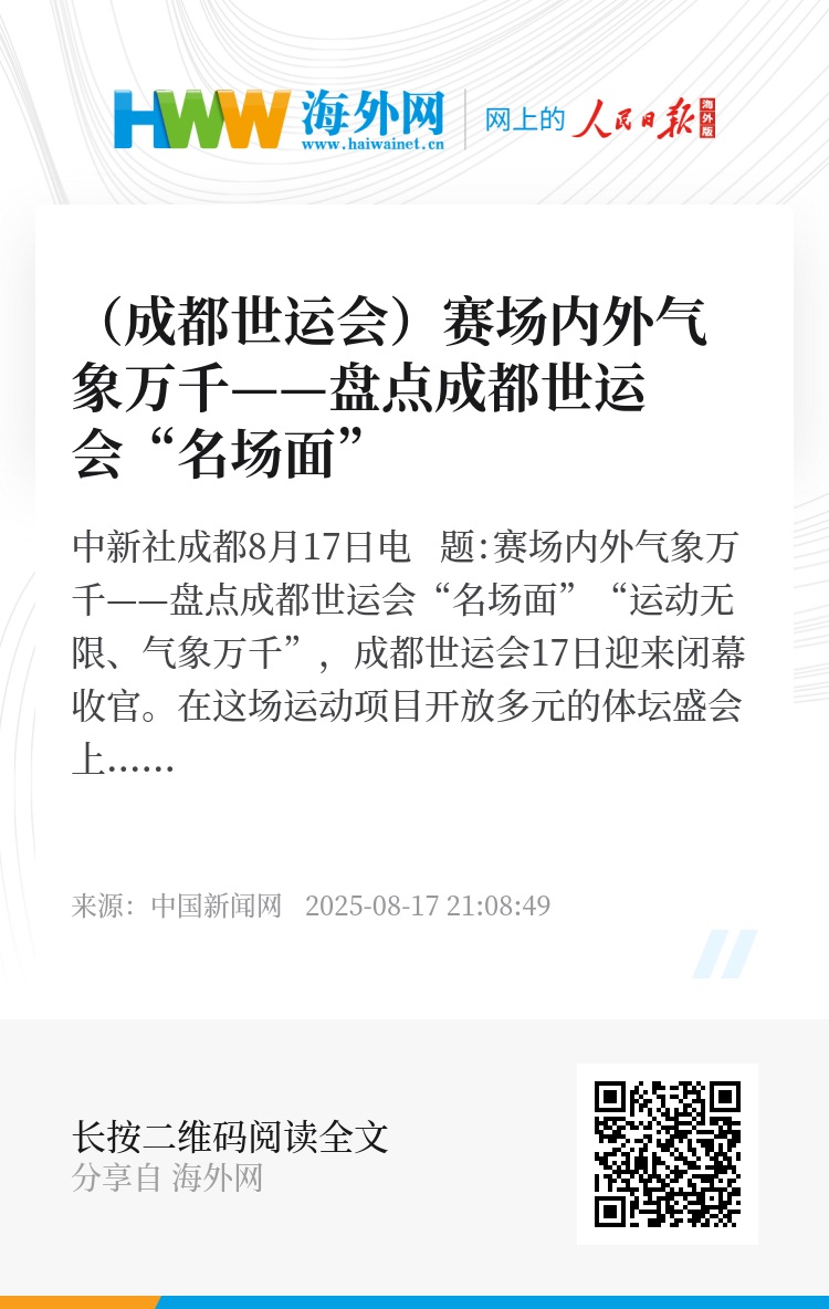 “运动无限、气象万千”,成都世运会17日迎来闭幕收官。在这场运动项目开放多元的体坛盛会上,人文交流跨越山海、彼此联结,一个个闪光的“名场面”串联起气象万千的世运全景。