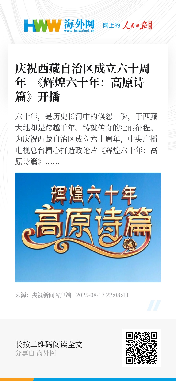为庆祝西藏自治区成立六十周年,中央广播电视总台精心打造政论片《辉煌六十年:高原诗篇》,8月17日起,在总台央视综合频道(CCTV-1)、中文国际频道(CCTV-4)播出,央视新闻、央视频、央视网等总台新媒体平台同步上线。