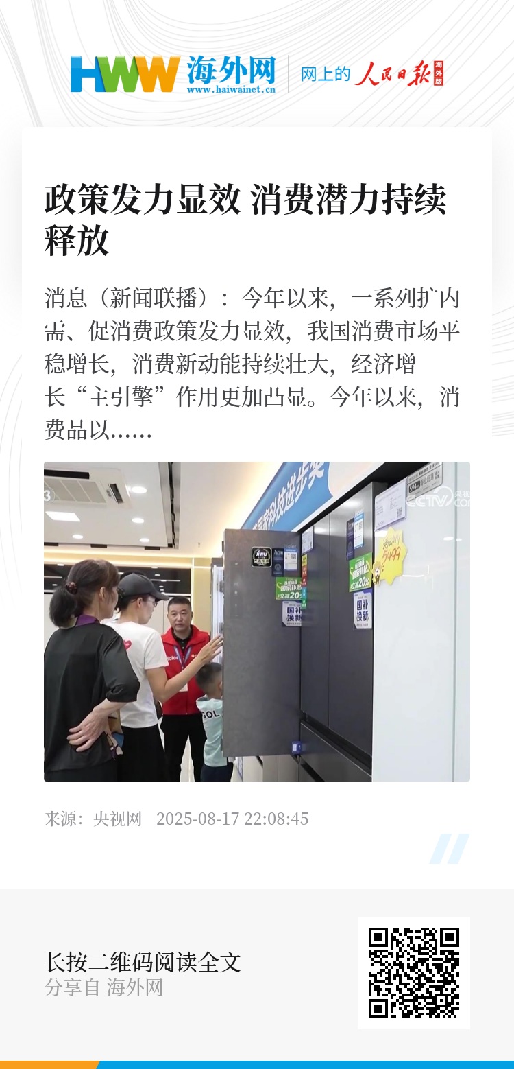 央视网消息(新闻联播):今年以来,一系列扩内需、促消费政策发力显效,我国消费市场平稳增长,消费新动能持续壮大,经济增长“主引擎”作用更加凸显。