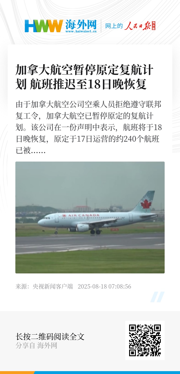 加航于17日早些时候宣布将于当天晚上逐步恢复运营。随后工会方面表示,他们将继续罢工,工会在声明中写道“我们希望加拿大航空公司重返谈判桌,达成公平的协议”。(总台记者 张森)