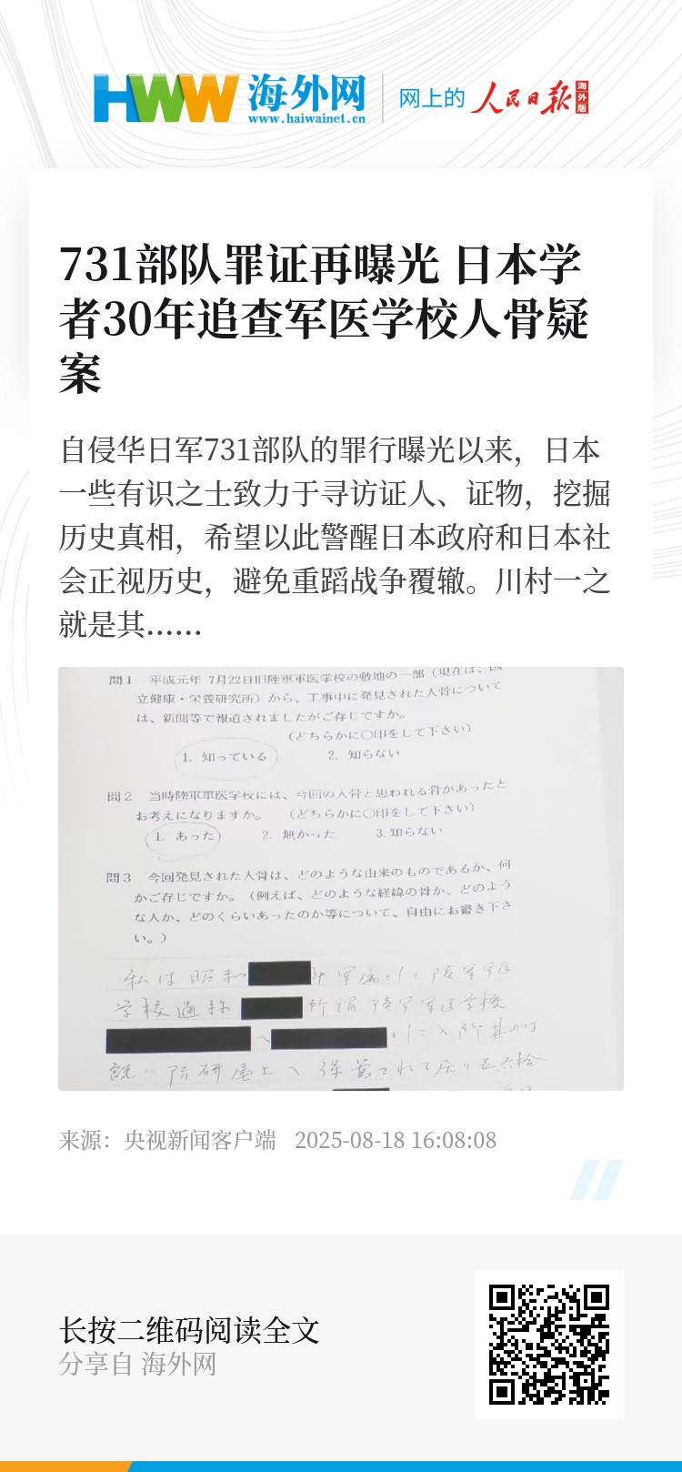 日本细菌战研究学者 川村一之:厚生劳动省大约拖了十年,才发布了调查报告。再过了二十年,才终于公开了1993年原始调查问卷的内容。这么多年,耽误了大量的时间,如果当时就知道是谁回答的问卷,他们应该还在世,现在恐怕已经去世了。