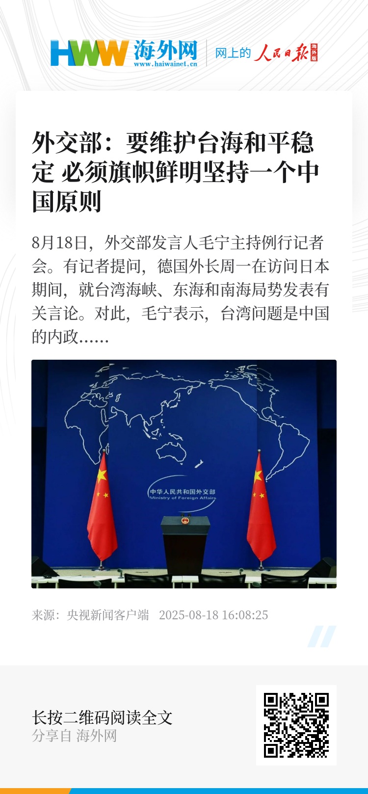 8月18日,外交部发言人毛宁主持例行记者会。有记者提问,德国外长周一在访问日本期间,就台湾海峡、东海和南海局势发表有关言论。