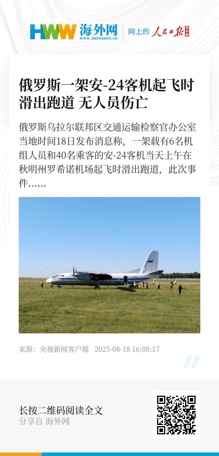俄罗斯乌拉尔联邦区交通运输检察官办公室当地时间18日发布消息称,一架载有6名机组人员和40名乘客的安-24客机当天上午在秋明州罗希诺机场起飞时滑出跑道,此次事件中无人员伤亡。(总台记者 王斌)