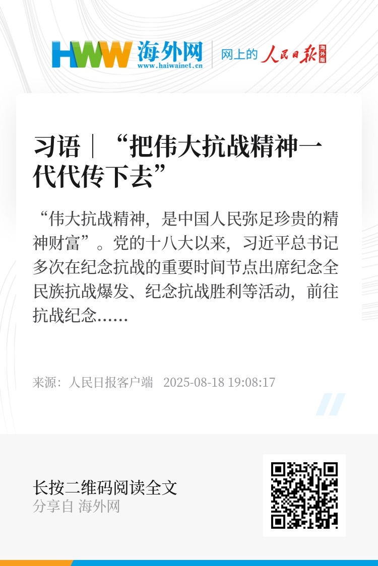 “伟大抗战精神,是中国人民弥足珍贵的精神财富,将永远激励中国人民克服一切艰难险阻、为实现中华民族伟大复兴而奋斗。”