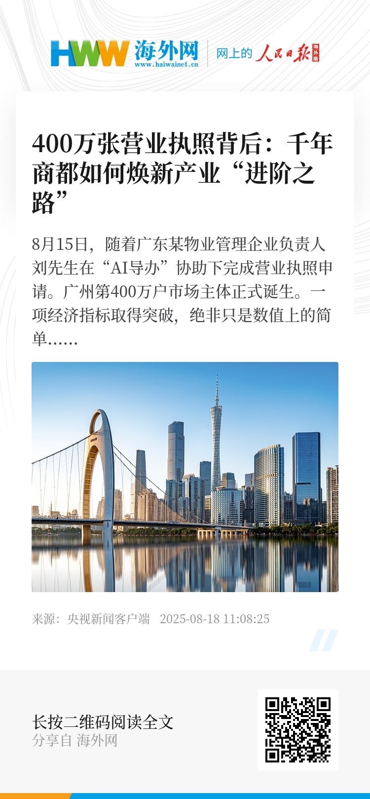 在2025年《中国宜居城市30强》评选中,广州位列全国第一。从率先推行商事登记全程电子化,到实现开办企业“一网通办、一窗通取”,再到如今“AI导办”“AI帮办”“AI审批”智能服务全域覆盖。实现开办企业办理营业执照从过去的20个工作日压缩至10分钟以内,线上申办率高达99%……市场主体看得见、享得到的实在便利背后,是广州紧扣市场主体成长需求“量体裁衣”的主动服务,更有从实际出发、实事求是的支持态度。