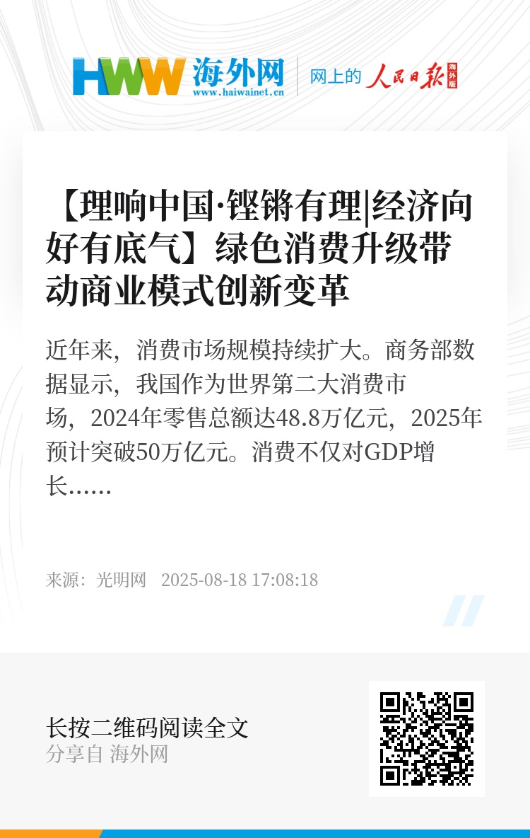 消费是经济循环的终点,也是新起点。绿色消费是消费领域的一场系统性变革,其发展、壮大将带动一大批绿色产业加速崛起,推动形成绿色生产力。绿色消费,是整个社会生产力和生产关系的重塑。要坚持政府引导、市场主导,在增强消费能力、改善消费条件、创新消费场景上持续发力,这样必将同步推进消费升级与绿色转型,让高质量发展的绿色底色更鲜亮。