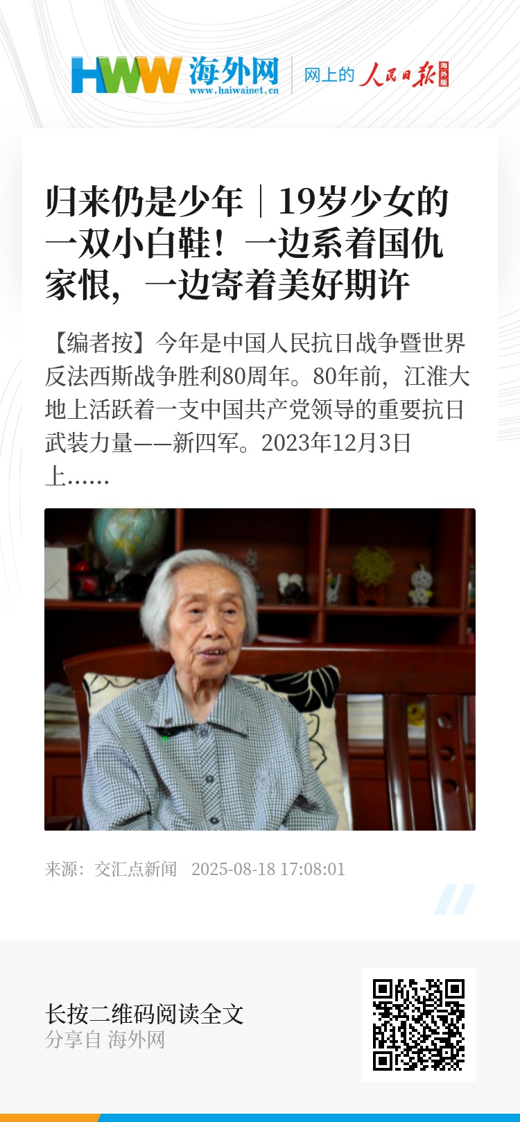 “抗战时期,我是踏着父亲的鲜血前行的。”每每回望80年前的硝烟岁月,95岁的周淑真老人总会提起一张老照片。那张黑白照片上,19岁的女战士周淑真身着军装,脚上却穿着一双小白鞋——2025年盛夏,“归来仍是少年”采访组在周淑真老人南京家中记录下了“一双小白鞋”的故事。这双鞋,承载着战争年代一对父女的生离死别……