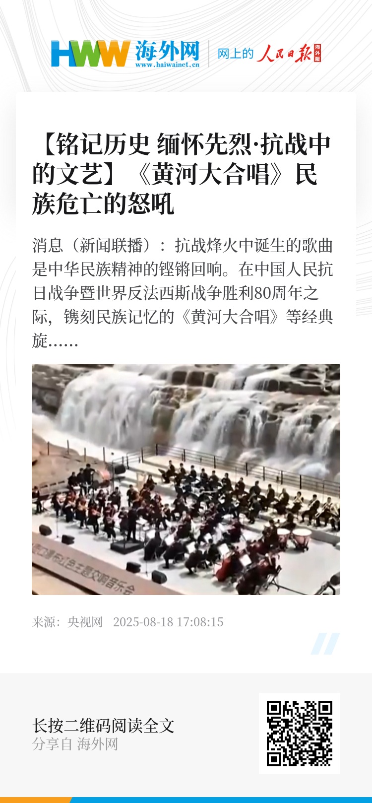 央视网消息(新闻联播):抗战烽火中诞生的歌曲是中华民族精神的铿锵回响。在中国人民抗日战争暨世界反法西斯战争胜利80周年之际,镌刻民族记忆的《黄河大合唱》等经典旋律再度激荡人心,它们曾如号角唤醒民众,更凝聚着共赴国难的家国情怀。