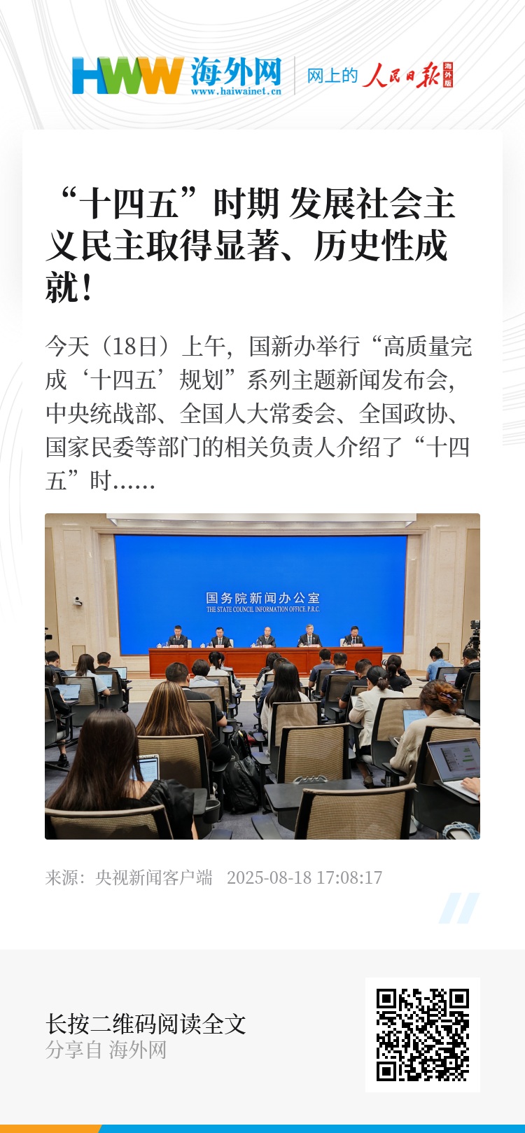 今天(18日)上午,国新办举行“高质量完成‘十四五’规划”系列主题新闻发布会,中央统战部、全国人大常委会、全国政协、国家民委等部门的相关负责人介绍了“十四五”时期发展社会主义民主有关情况。