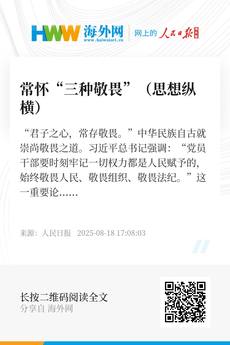 “君子之心,常存敬畏。”中华民族自古就崇尚敬畏之道。习近平总书记强调:“党员干部要时刻牢记一切权力都是人民赋予的,始终敬畏人民、敬畏组织、敬畏法纪。”这一重要论述,不仅是对中华优秀传统文化中敬畏之道的赓续与升华,更蕴含着新时代治党治国的深邃智慧。“三种敬畏”从坚持党的根本宗旨、遵从党的组织制度、严守党纪国法3个方面,彰显出共产党人心有所畏、言有所戒、行有所止的境界。
