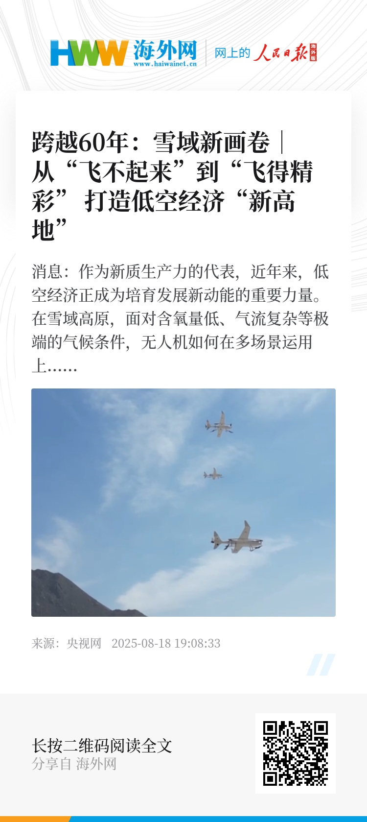 央视网消息:作为新质生产力的代表,近年来,低空经济正成为培育发展新动能的重要力量。在雪域高原,面对含氧量低、气流复杂等极端的气候条件,无人机如何在多场景运用上取得技术突破,又如何凭借自身的灵活性和高效性在应急救援、生态监测等领域大展身手。系列报道《跨越60年:雪域新画卷》17日走进西藏山南市,一起来看看世界屋脊上的无人机产业新机遇。