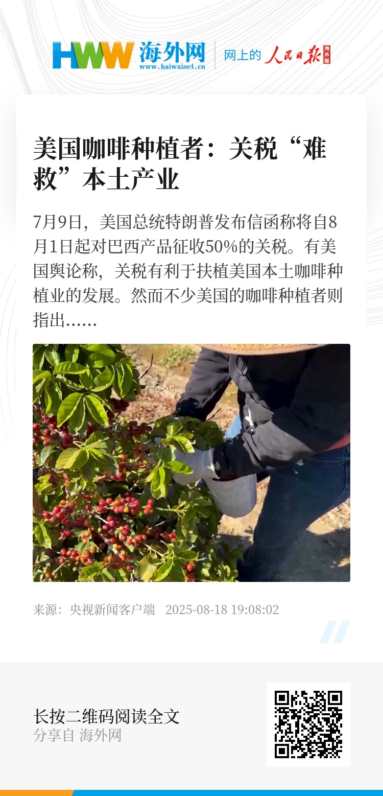 而与此同时,在一些美国舆论宣称“关税将扶植美国本土咖啡种植业”时,不少美国咖啡种植者对此表示反对。他们表示,美国的咖啡面临生产成本高、气候不宜等问题,无法取代进口咖啡,关税政策并不能给他们提供实际帮助。