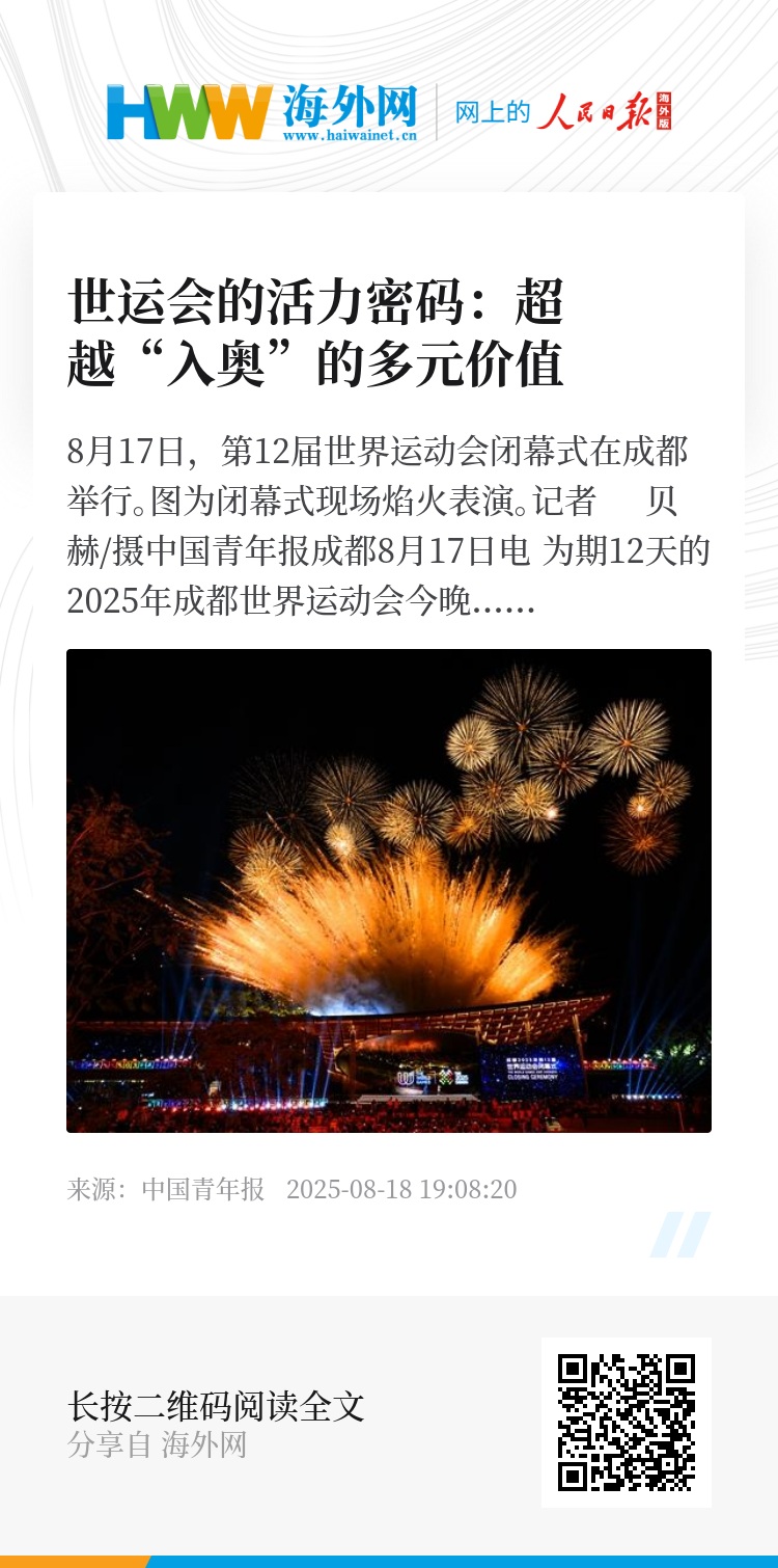 “我们的责任是向全世界展示最好的(非奥)项目。”国际世界运动会协会主席何塞·佩鲁雷纳表示,成都打造了一个空前精美的“橱窗”,“为未来的世运会主办城市设立了新标准”。作为东道主,成都世运会亦是一扇厚重大门,门后是中国体育多元发展的方向。