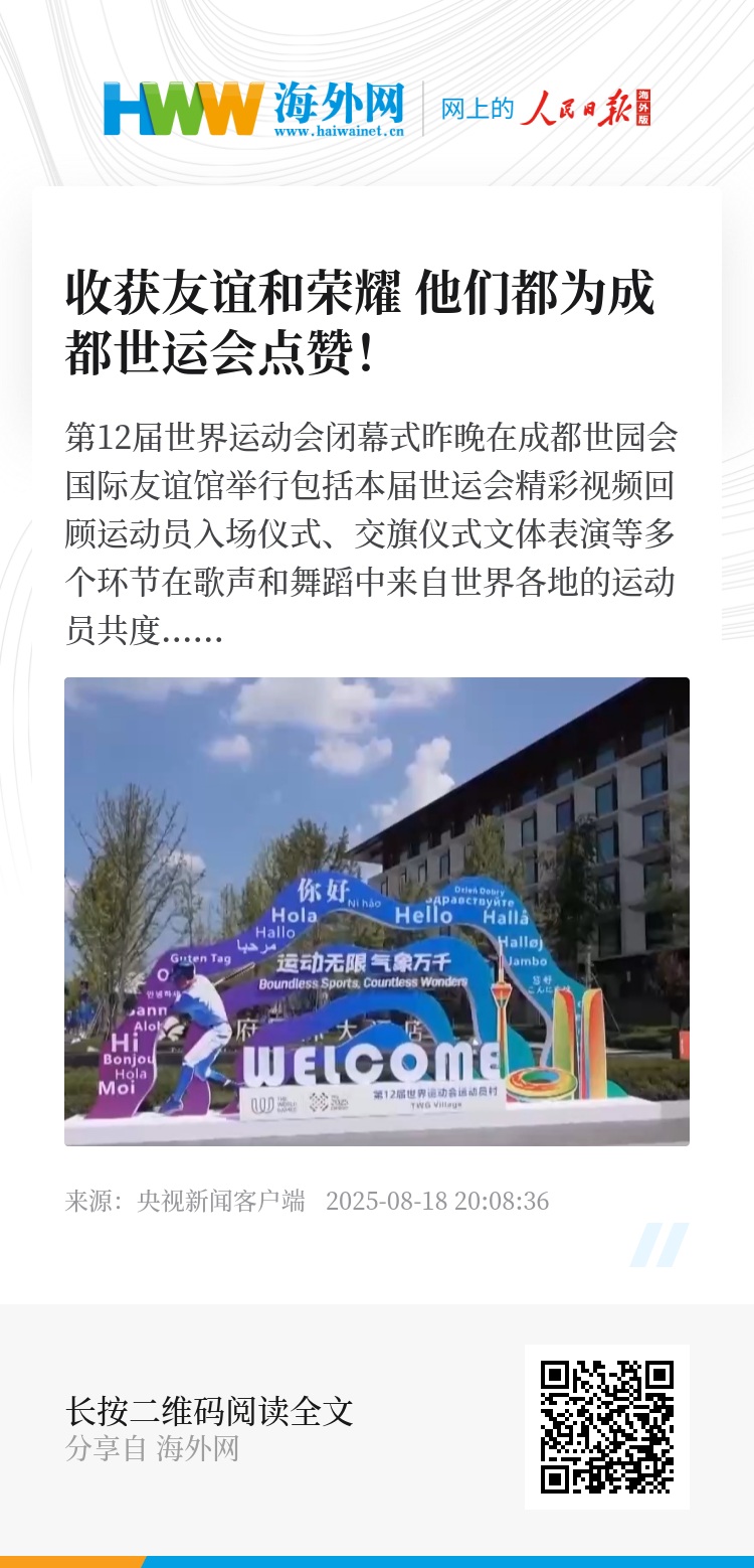 成都世运会斯洛伐克代表团团长 乌拉诺斯:成都世运会的经历太棒了,赛事组织管理和赛场氛围都近乎完美。我们期待下一届世运会取得更好的成绩。