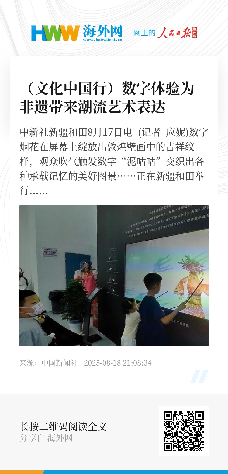 中新社新疆和田8月17日电 (记者 应妮)数字烟花在屏幕上绽放出敦煌壁画中的吉祥纹样,观众吹气触发数字“泥咕咕”交织出各种承载记忆的美好图景……正在新疆和田举行的2025“新疆是个好地方”非遗援疆主题展示活动上,非遗内涵与数字科技创造性结合成为一大亮点。