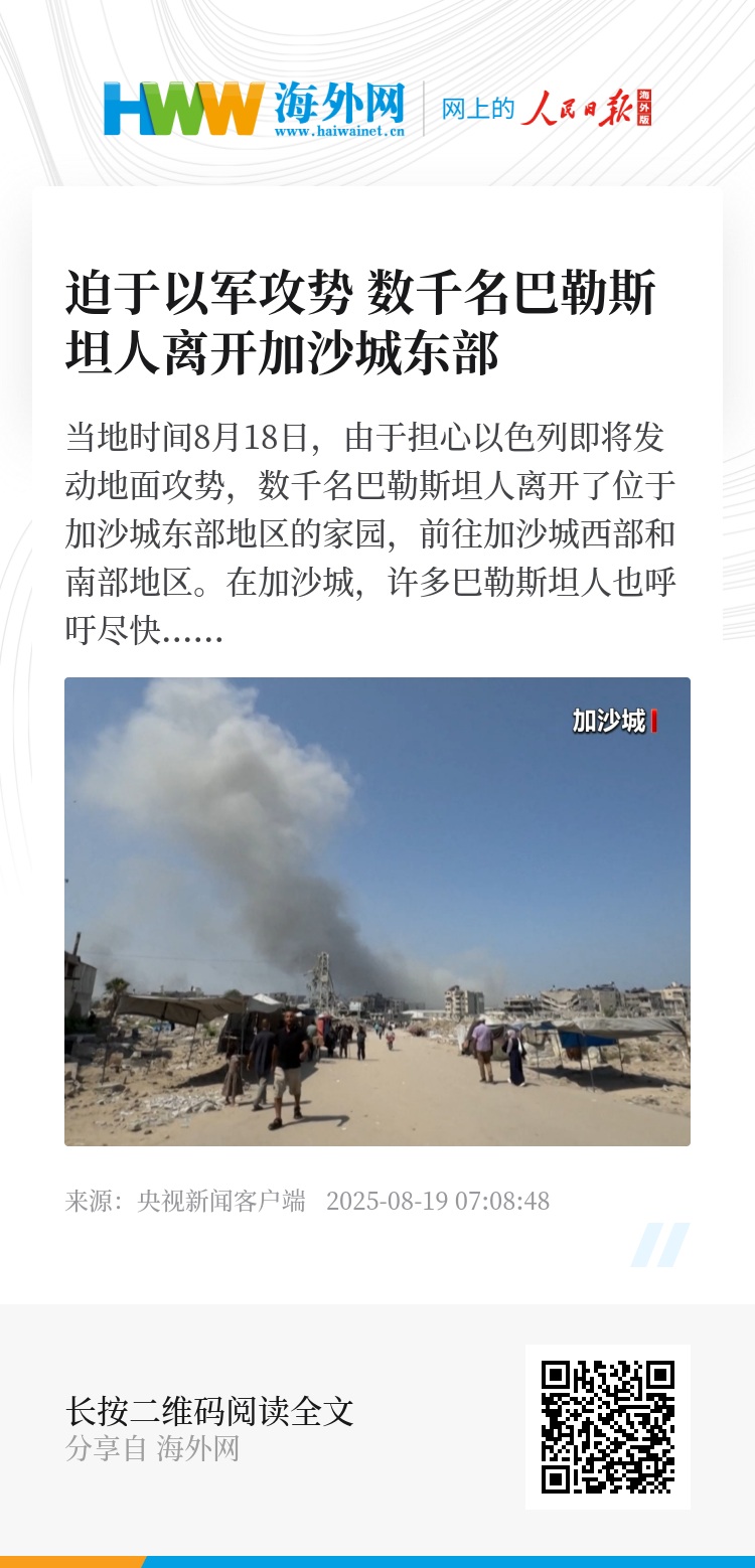 以色列军方17日宣布,将很快在加沙地带北部加沙城启动下一阶段军事行动。这可能涉及强制驱赶约100万名巴勒斯坦人,引发当地民众恐慌与焦虑。(总台记者 张卓雅)