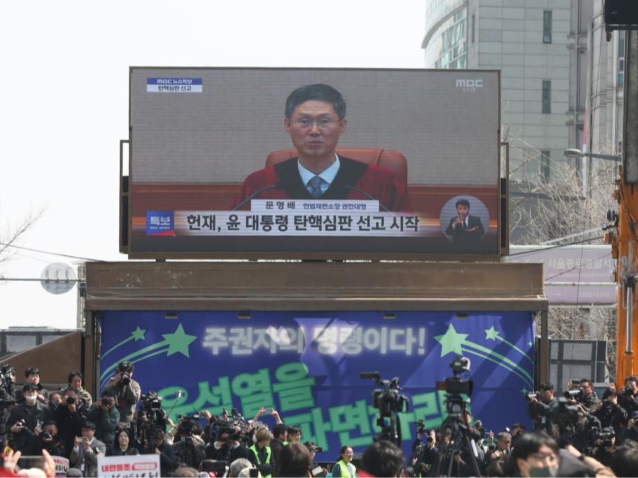 4月4日,民众在韩国首都首尔的韩国宪法法院附近观看尹锡悦弹劾案宣判过程的电视直播。新华社记者姚琪琳摄