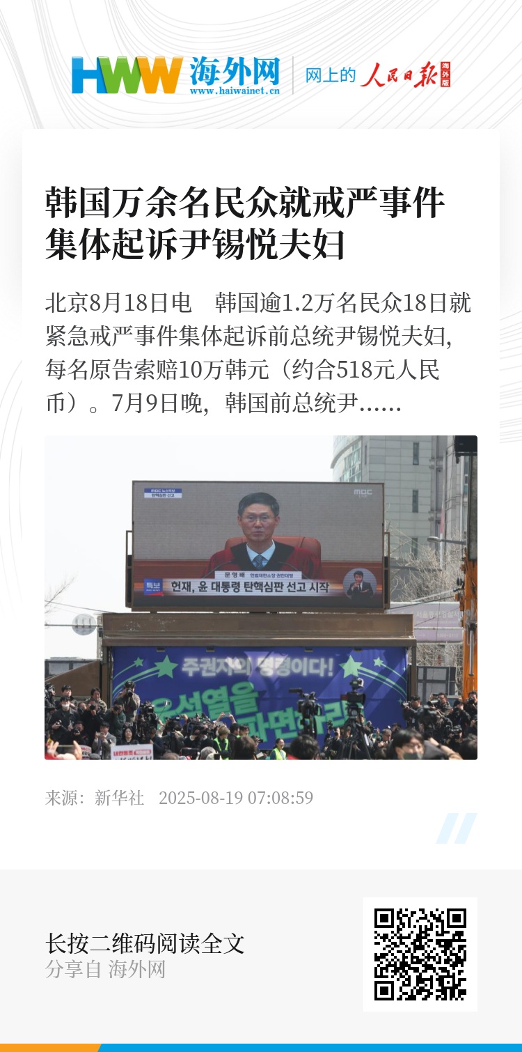 新华社北京8月18日电 韩国逾1.2万名民众18日就紧急戒严事件集体起诉前总统尹锡悦夫妇,每名原告索赔10万韩元(约合518元人民币)。