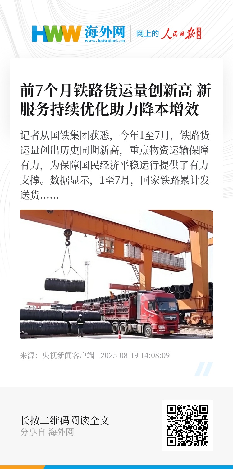 数据显示,1至7月,国家铁路累计发送货物23.31亿吨,日均装车18.33万车,同比分别增长3.3%、4.1%。煤炭等重点物资运输效率提升。