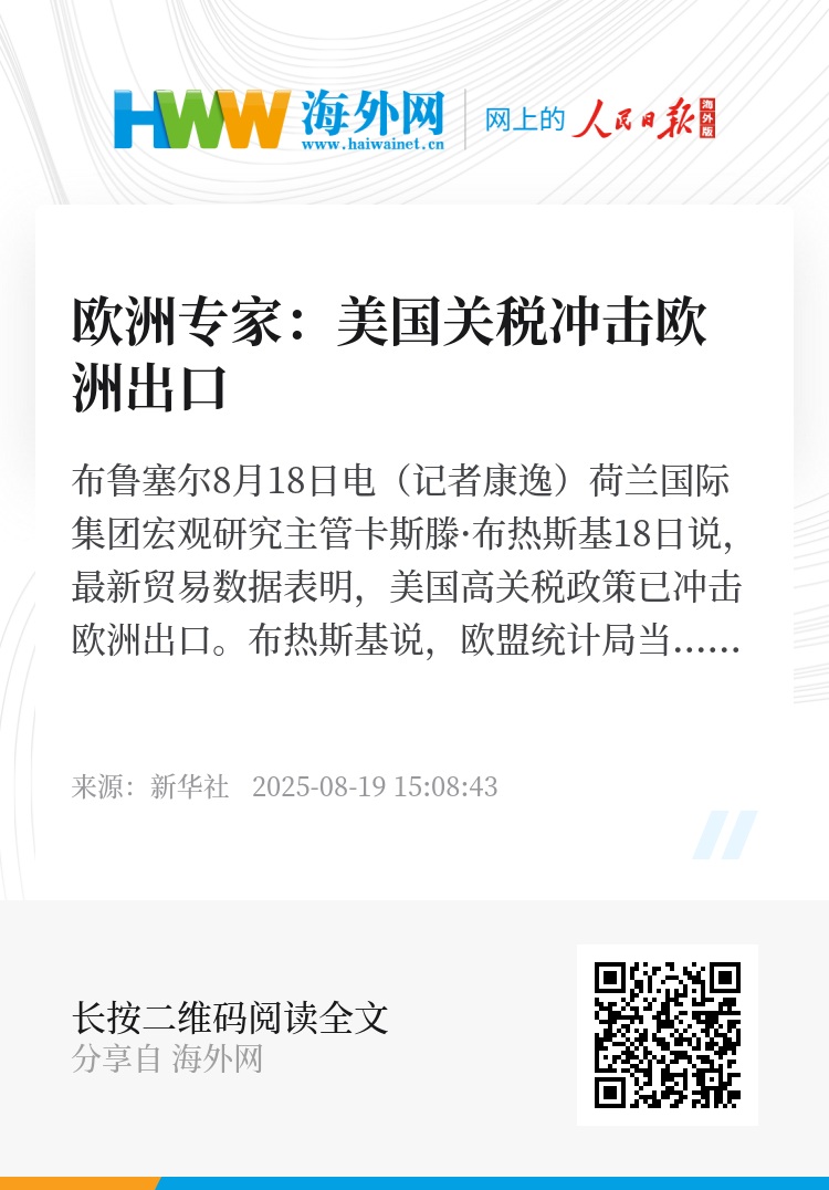 新华社布鲁塞尔8月18日电(记者康逸)荷兰国际集团宏观研究主管卡斯滕·布热斯基18日说,最新贸易数据表明,美国高关税政策已冲击欧洲出口。
