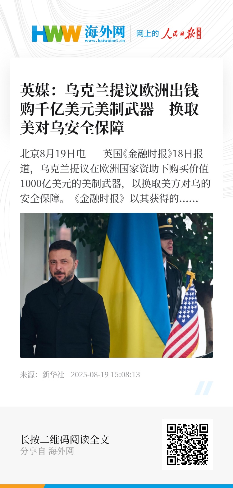 新华社北京8月19日电 英国《金融时报》18日报道,乌克兰提议在欧洲国家资助下购买价值1000亿美元的美制武器,以换取美方对乌的安全保障。