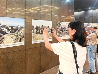 图为台北市民在参观“抗战胜利暨台湾光复80周年”纪念图片特展。