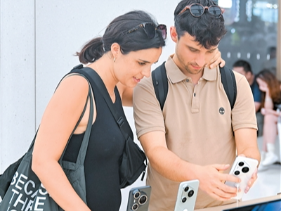 今年上半年,上海海关共验核离境退税申请单6.4万票,比去年同期大幅增长1.4倍。图为7月17日,两名西班牙游客在位于上海市南京路步行街的华为商店里浏览手机产品。