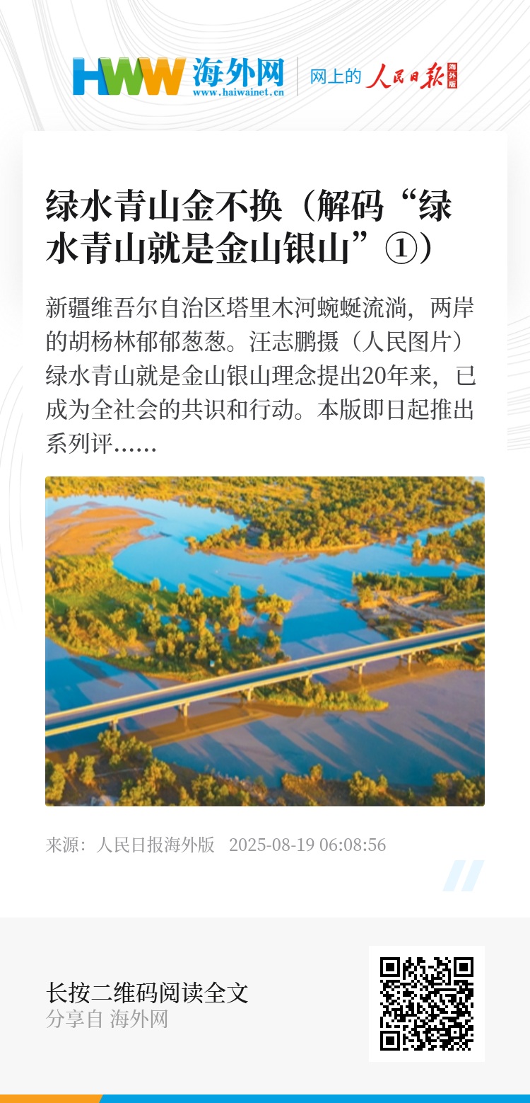 绿水青山金不换。在生态银行里存储的每片森林、每条河流、每寸湿地,都是在为未来签发可持续发展的信用证——唯有守护好绿水青山,才能让生态文明的火种在绿色星球的穹顶下生生不息。(作者 刘发为)(《人民日报海外版》2025年08月19日 第 08 版)