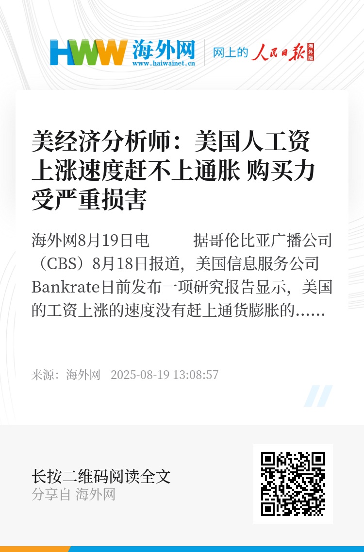 海外网8月19日电 据哥伦比亚广播公司(CBS)8月18日报道,美国信息服务公司Bankrate日前发布一项研究报告显示,美国的工资上涨的速度没有赶上通货膨胀的速度。