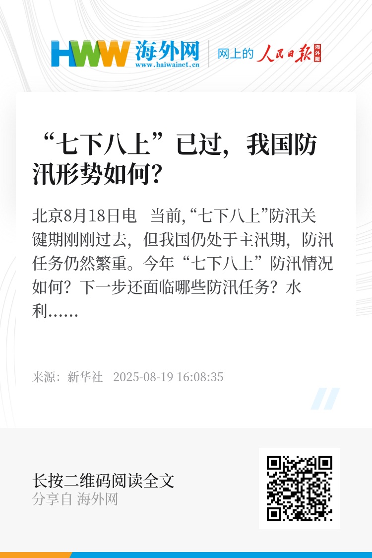 新华社北京8月18日电 当前,“七下八上”防汛关键期刚刚过去,但我国仍处于主汛期,防汛任务仍然繁重。