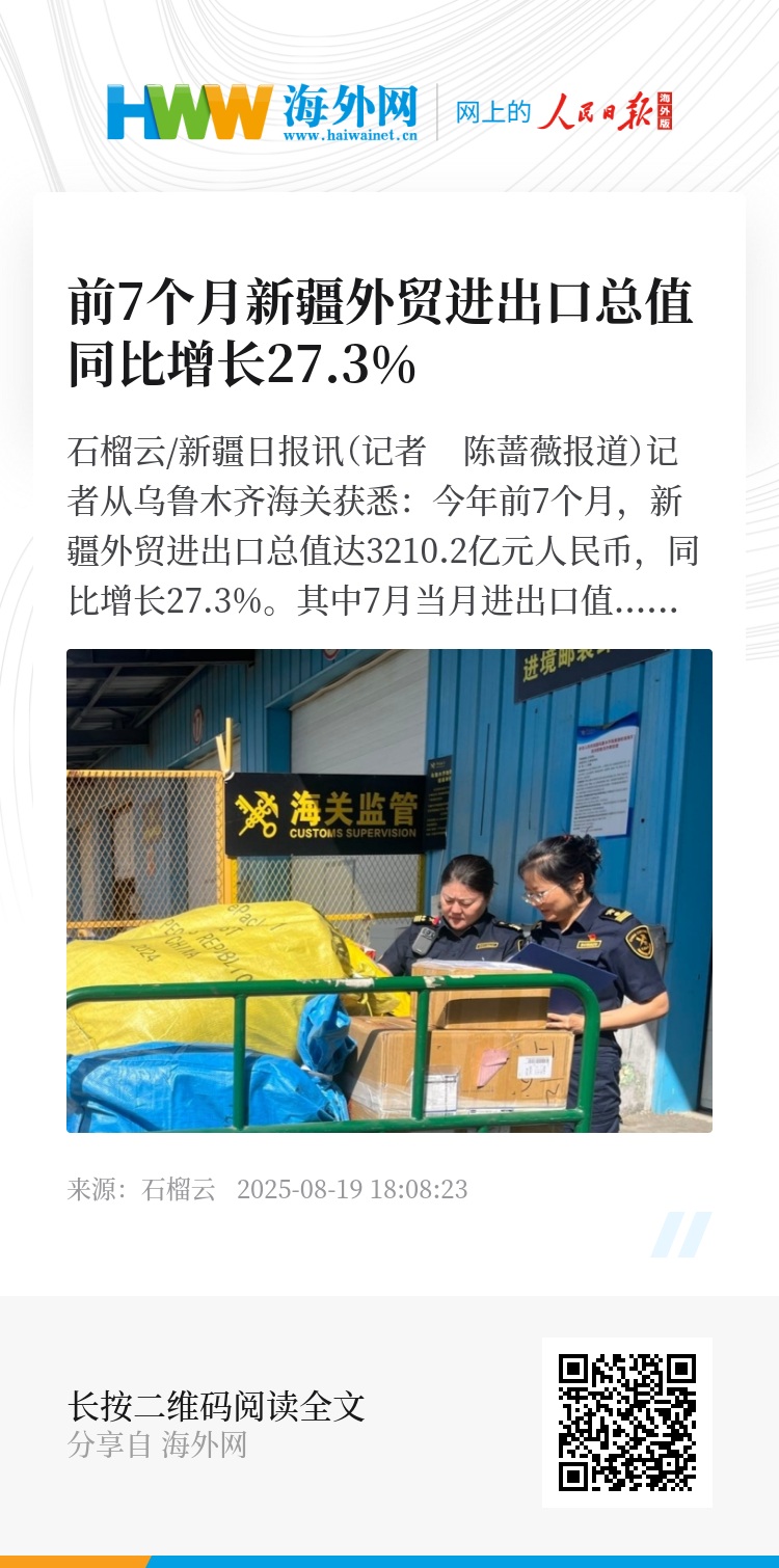 石榴云/新疆日报讯(记者 陈蔷薇报道)记者从乌鲁木齐海关获悉:今年前7个月,新疆外贸进出口总值达3210.2亿元人民币,同比增长27.3%。其中7月当月进出口值403.9亿元,同比增长23.5%,新疆外贸发展稳中有进。