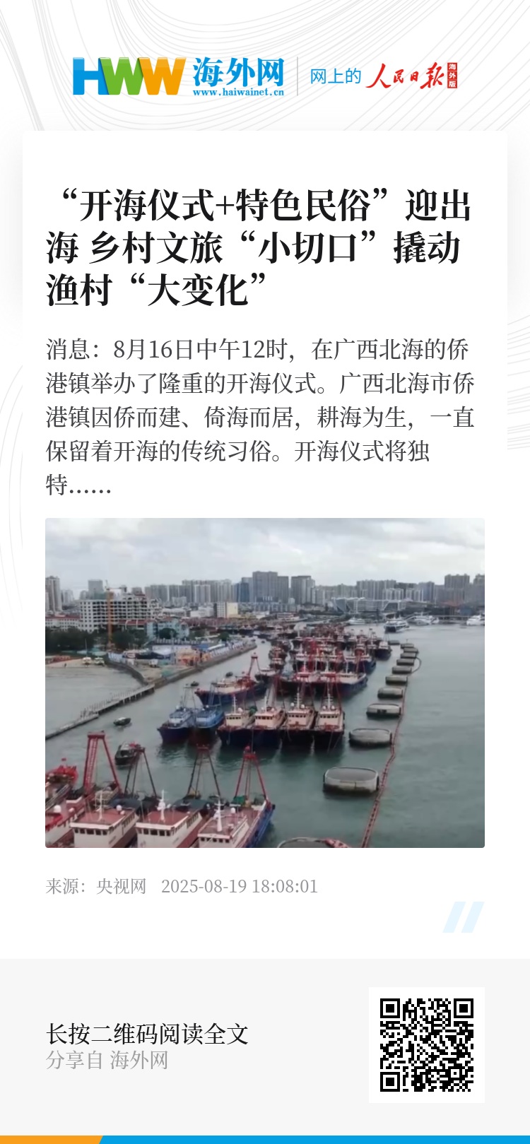 央视网消息:8月16日中午12时,在广西北海的侨港镇举办了隆重的开海仪式。