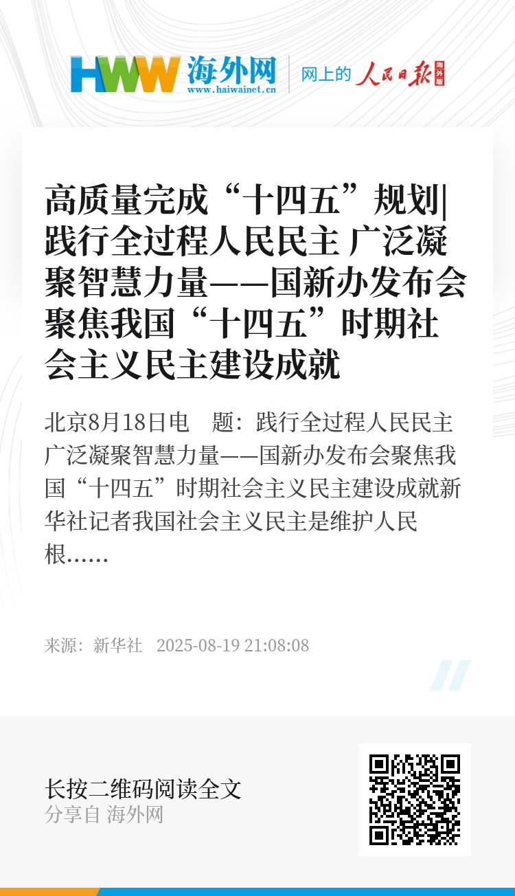 新华社北京8月18日电 题:践行全过程人民民主 广泛凝聚智慧力量——国新办发布会聚焦我国“十四五”时期社会主义民主建设成就