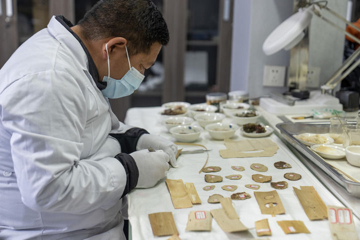 布达拉宫贝叶经实验性修复小组实验室工作人员对贝叶进行处理(2025年5月25日摄)。新华社记者 旦增尼玛曲珠 摄