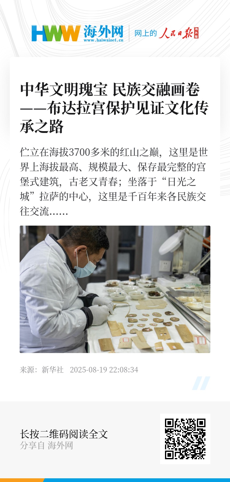 根据西藏自治区今年上半年发布的《布达拉宫保护利用工作整体方案》,2025年到2028年,西藏将完成465函贝叶经和39752函古籍的保护修复工作,数万函古籍文献将“走出深闺为人识”,让更多人领略中华优秀传统文化的智慧与魅力。