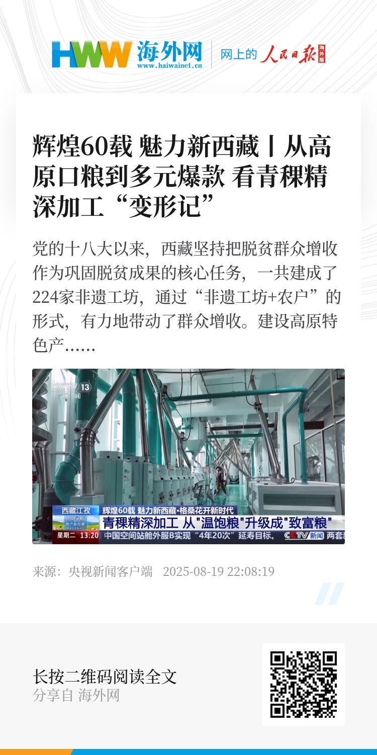 总台记者 于晨:我现在是在江孜县的一家专注于青稞产品研发的科技公司,去年9月,全国首条青稞谷物专用生产线在这里落地,填补了行业的空白,这让青稞的得粉率由原来的60%以下提升至了70%以上。