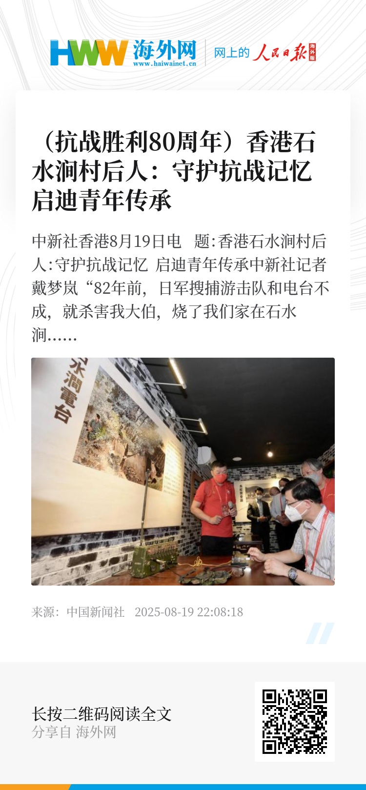 中新社香港8月19日电 题:香港石水涧村后人:守护抗战记忆 启迪青年传承