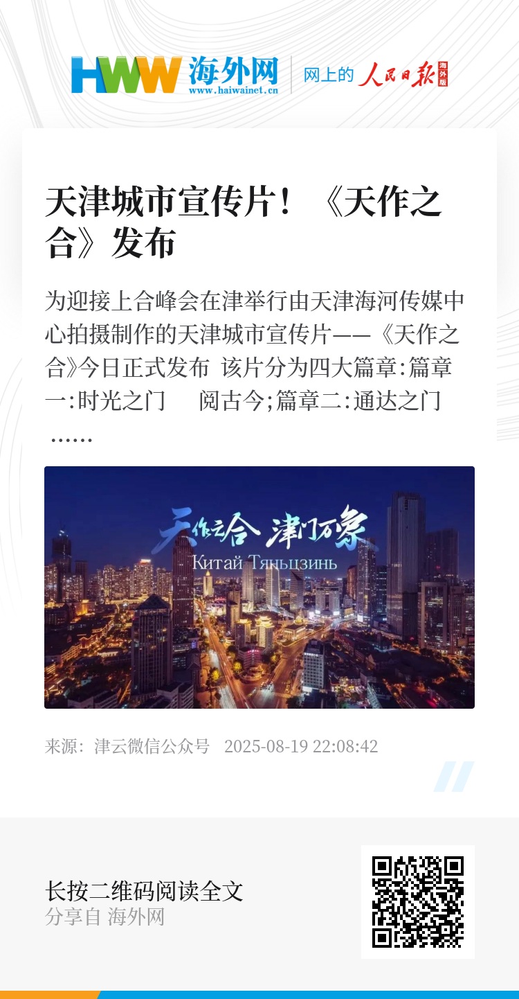 《天作之合》通过清新、震撼的极致影像,打造一部兼具文化深度与国际传播力的城市形象片,展现河海相映、中西合璧、古今交融、开放包容的天津城市形象,向世界展现天津的独特魅力。