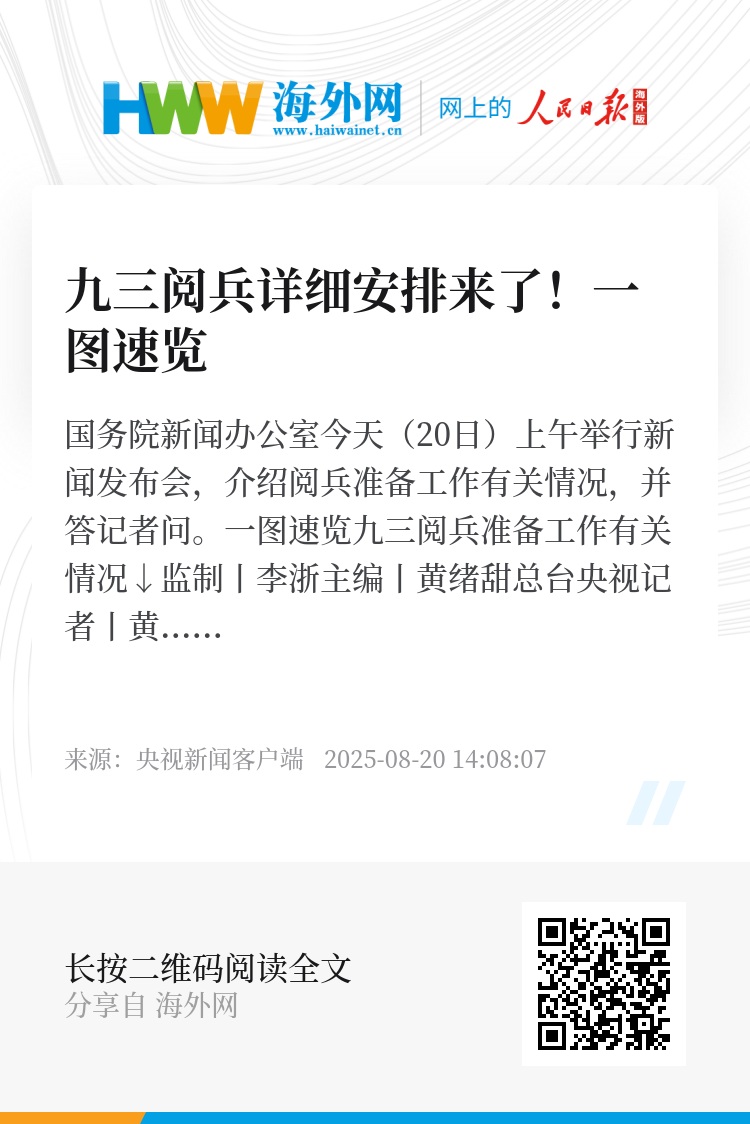 国务院新闻办公室今天(20日)上午举行新闻发布会,介绍阅兵准备工作有关情况,并答记者问。一图速览九三阅兵准备工作有关情况↓
