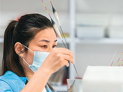 湖南临湘浮标特色小镇的临湘民间艺人钓具有限公司生产车间里,工人在生产浮标。据了解,全国八成浮标来自这里。