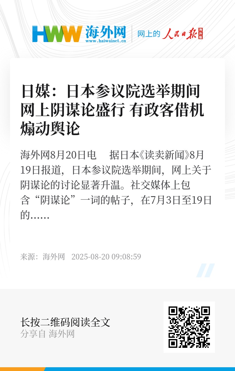 海外网8月20日电 据日本《读卖新闻》8月19日报道,日本参议院选举期间,网上关于阴谋论的讨论显著升温。社交媒体上包含“阴谋论”一词的帖子,在7月3日至19日的选举期间,日均数量激增到4.5万条。