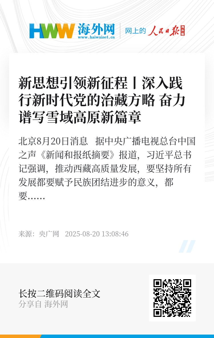 央广网北京8月20日消息 据中央广播电视总台中国之声《新闻和报纸摘要》报道,习近平总书记强调,推动西藏高质量发展,要坚持所有发展都要赋予民族团结进步的意义,都要赋予改善民生、凝聚人心的意义,都要有利于提升各族群众获得感、幸福感、安全感。