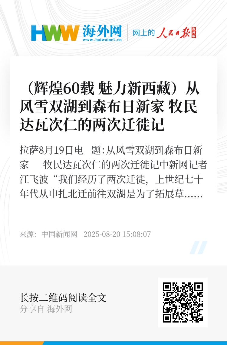 中新网拉萨8月19日电 题:从风雪双湖到森布日新家 牧民达瓦次仁的两次迁徙记