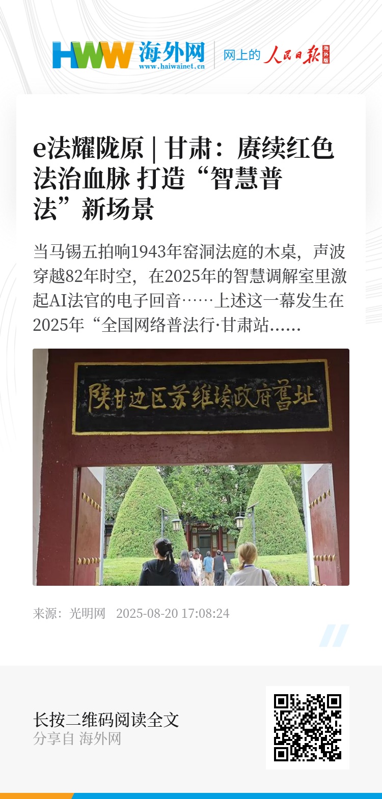 从“刘巧儿抗婚案”的历史记忆到“巧儿说法”的品牌实践,庆阳将红色法治遗址、经典案例作为“活教材”,既通过数字化手段激活其在传统治理中的时代价值,又结合网络空间治理需求赋予新内涵,让红色法治精神与基层治理、网络文明建设同频共振,为革命老区提供“以文化人、以法治网”的新路径。