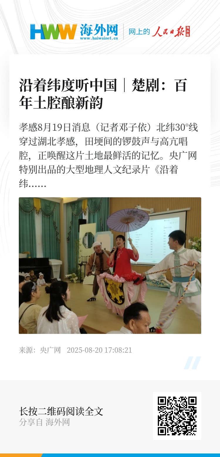 央广网孝感8月19日消息(记者邓子依)北纬30°线穿过湖北孝感,田埂间的锣鼓声与高亢唱腔,正唤醒这片土地最鲜活的记忆。央广网特别出品的大型地理人文纪录片《沿着纬度听中国》第一季第三集《民间戏曲》,便将镜头聚焦于孝感——这里不仅是“黄香温衾”“孟宗哭笋”等孝文化故事的发源地,更孕育了国家级非物质文化遗产楚剧。