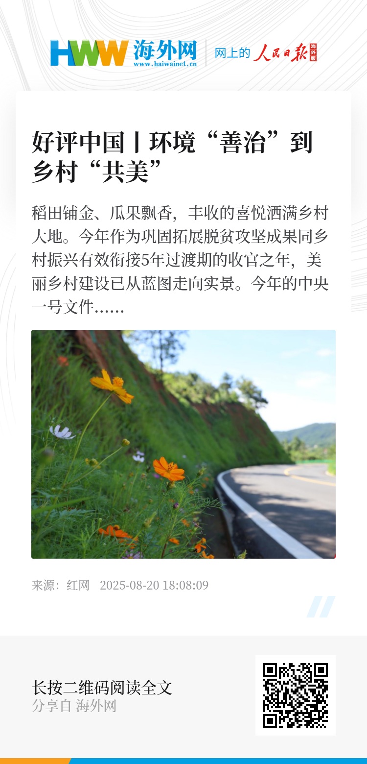 美丽乡村,说到底是要居住的人认可“美丽”。对于近5亿常住农村人口而言,万家灯火的温暖离不开住得舒心的人居环境,这是村民对“美丽”最直接的感知。从“厕所革命”破解民生痛点,到污水治理实行分区分类施策,再到垃圾分类向乡村延伸覆盖,农村的人居环境的改善不止是村容村貌的提升,更是缩小城乡差距,提高农村居民幸福感的“民生密码”。湖南省湘潭市以“五共”(共谋、共建、共管、共评、共享)为治理理念,建立网格化管理制度,凝聚村民合力齐抓共管;湖南省怀化市沅陵县通过卫生评比激发群众主动性,让垃圾及时清扫成为乡村新风尚。这些实践印证了人居环境的整治,是美丽乡村建设最基础也是最关键的部分。只有让村里人住得安心,才能让外面人看得倾心,为乡村发展攒足人气与机遇。