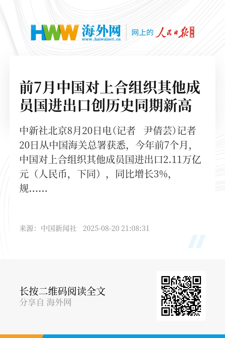 中新社北京8月20日电(记者 尹倩芸)记者20日从中国海关总署获悉,今年前7个月,中国对上合组织其他成员国进出口2.11万亿元(人民币,下同),同比增长3%,规模创历史同期新高。
