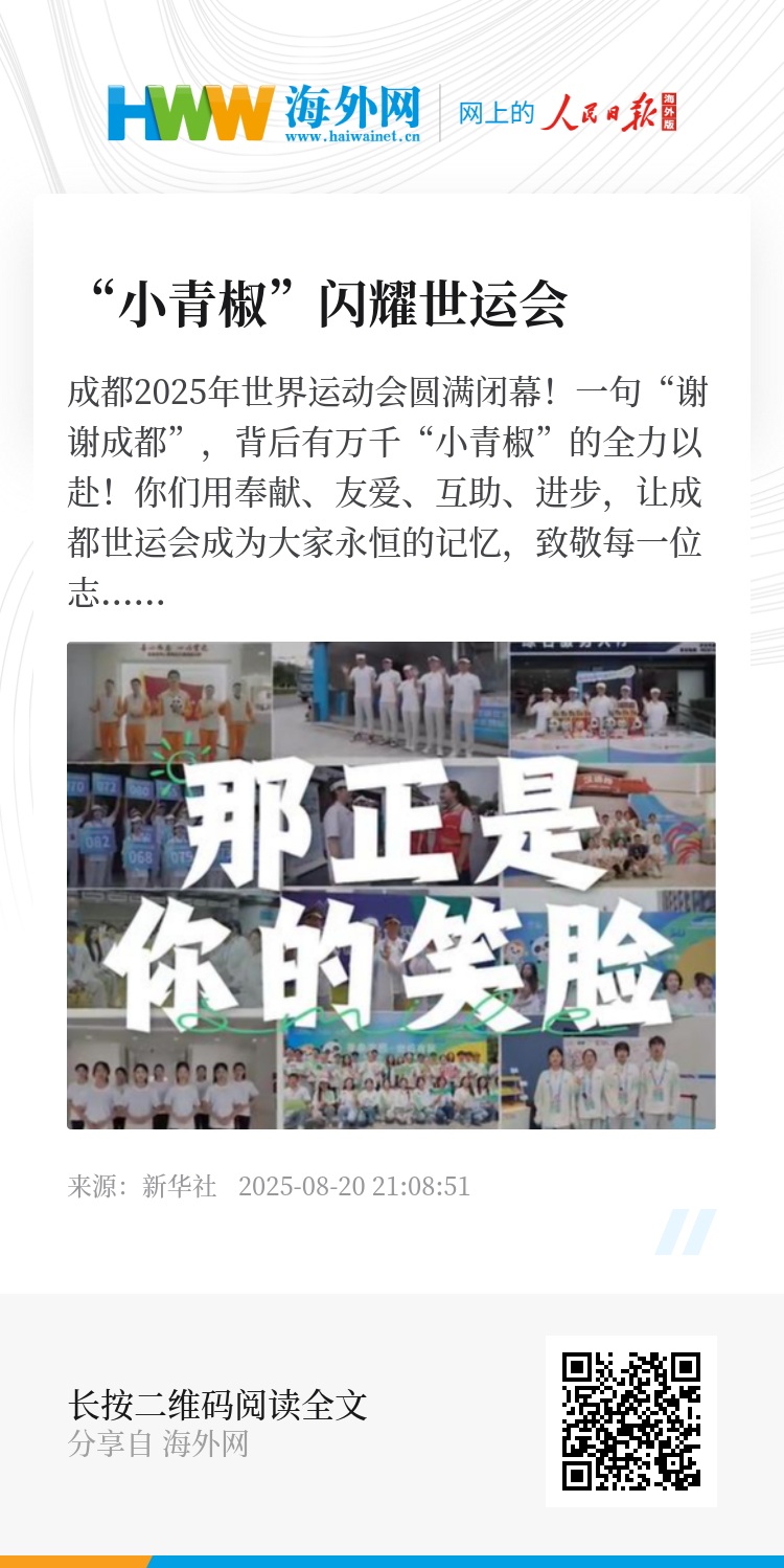 成都2025年世界运动会圆满闭幕!一句“谢谢成都”,背后有万千“小青椒”的全力以赴!你们用奉献、友爱、互助、进步,让成都世运会成为大家永恒的记忆,致敬每一位志愿者!成都世运会,因你们而骄傲!(记者:薛玉斌、董小红,联合发布:新华社、成都2025年世界运动会,特别感谢:沙桐)