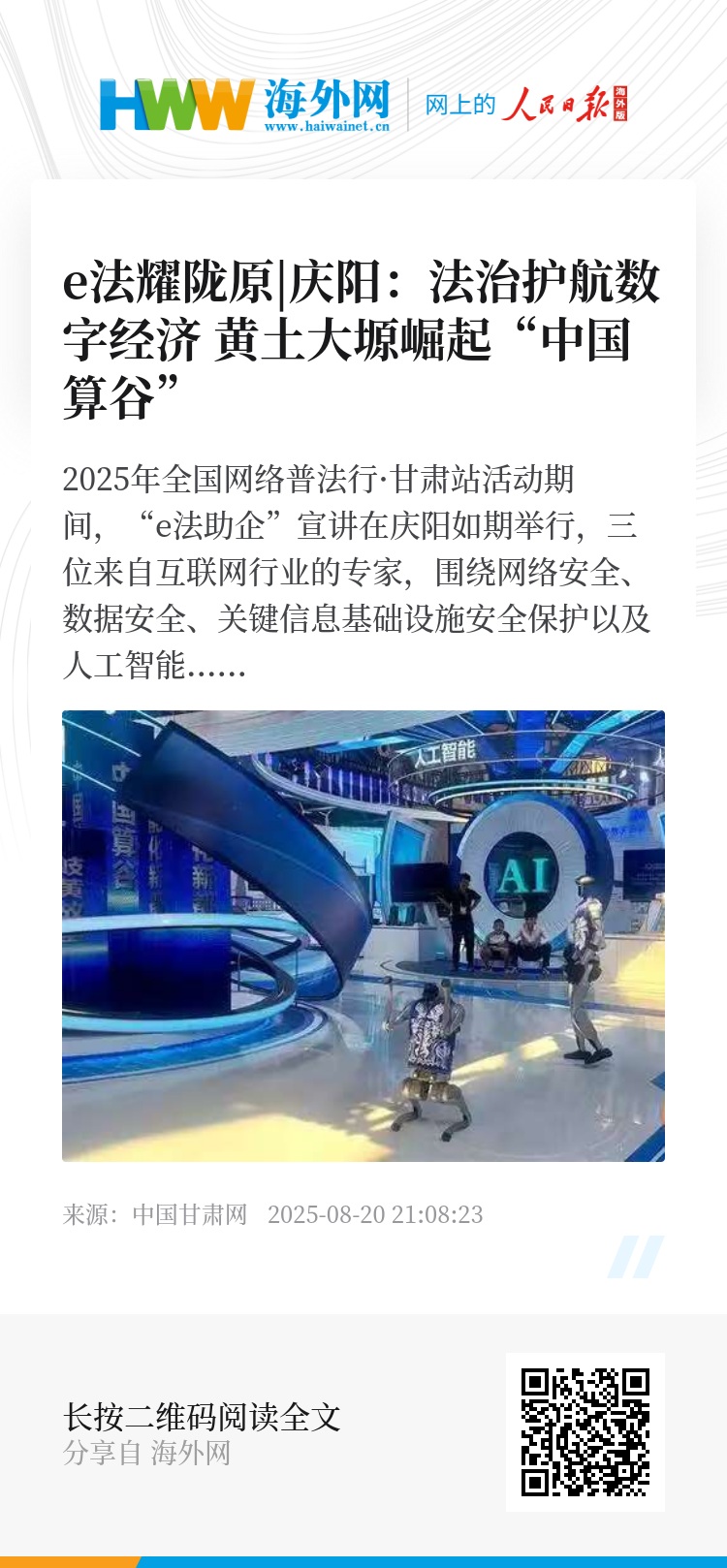 而法治,作为“稳定器”与“护航者”,在这一宏大进程中扮演着不可或缺的角色,从多维度为“中国算谷”的稳健前行提供坚实保障。成为庆阳市网络普法的自觉行动和行业发展的健康源泉。