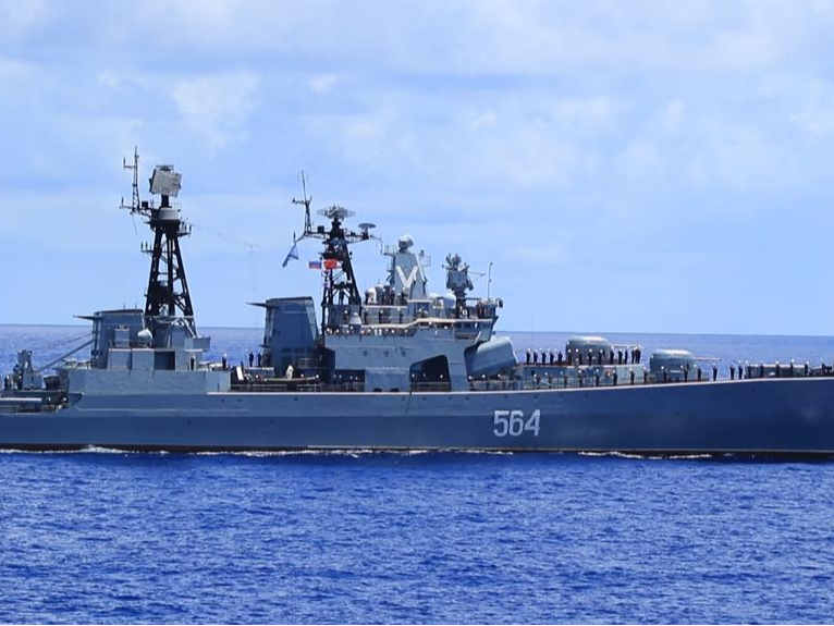 中俄“海上联合-2025”联合演习当地时间1日至5日在俄罗斯符拉迪沃斯托克附近海空域举行。演习结束后,参与演习的中国海军导弹驱逐舰绍兴舰、综合补给舰千岛湖舰与俄罗斯海军“特里布茨海军上将”号大型反潜舰等3艘水面舰艇及2架舰载直升机组成联合编队,位西太平洋某海域组织海上联合巡航。